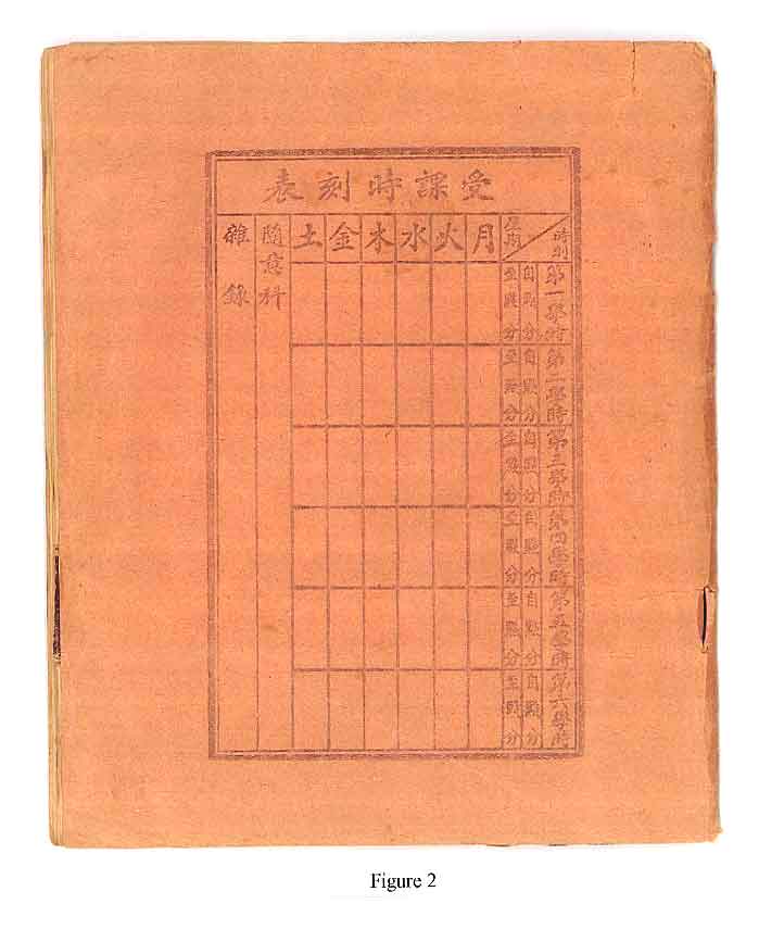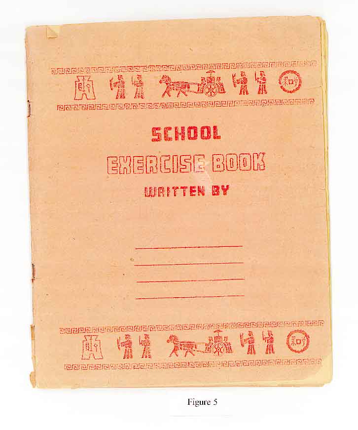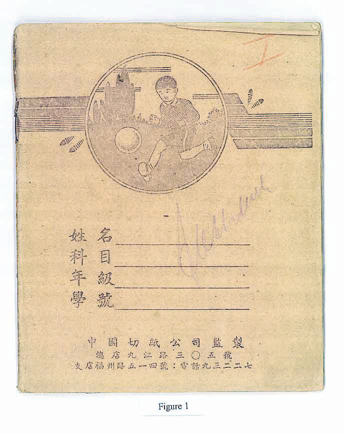 Those who have attended Shanghai reunions, read books about the Shanghai ghetto, or clicked on the Rickshaw Website, have already seen photographs of refugee students, young and older, in the classroom, or as a group in the schoolyards. Many, however, have not seen, since their departure from Shanghai, the composition books we used for our lessons. The following notebooks, the way I remember them, and illustrated in this report, were used at Kadoorie School, Freysinger School, and Seymour Road School. A notebook was not, as currently defined, a lap top computer, but instead a small flimsy composition book, with grainy pages. Figure one shows the front cover of one such notebook, while figure two illustrates the back outside cover. A second notebook is illustrated in figure three, while figure four also shows the back outside cover. A third notebook is seen in figure five.