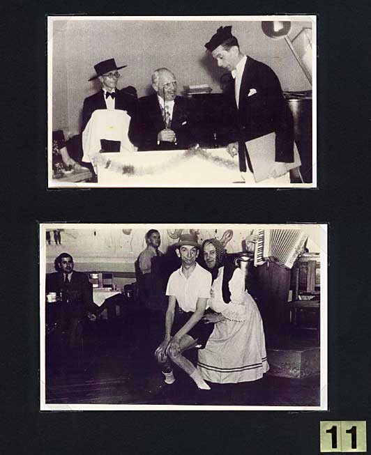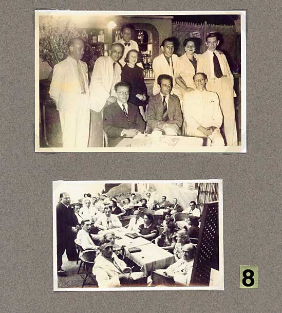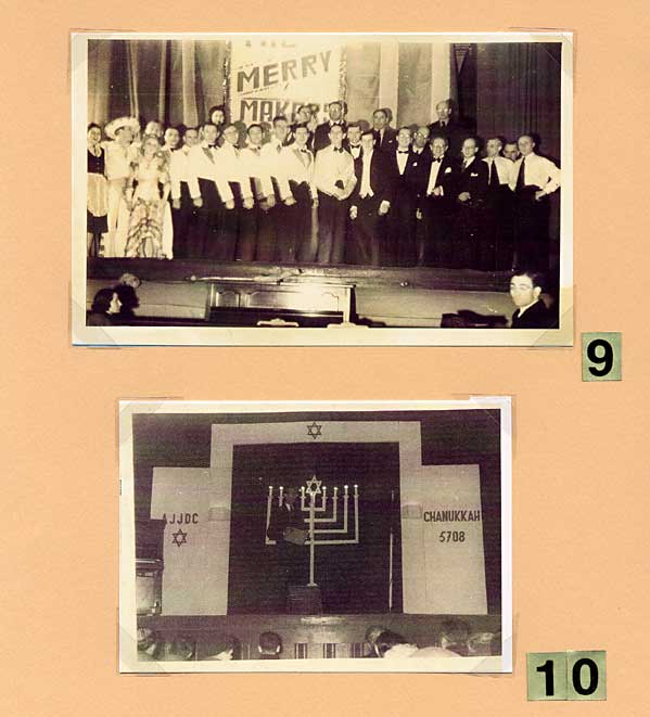 In figure eight, we see two photographs taken in 1940 of Mr. Gottschalk mingling with his friends and fellow performers at a bar and in a garden restaurant in Hongkew. A photo in figure nine, shows a group of performers on stage during a 1940 musical, "The Merry Makers".