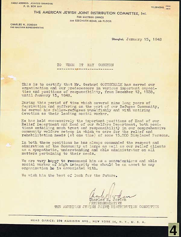 Gottschalk‘s main function as an administrator was with the American Jewish Joint Distribution Committee (JDC), where he served from December of 1938, to January of 1948. There he held the important positions as head of JDC Relief Department, and head of its Welfare Department, which cared for the relief and rehabilitation needs of at one time, 15,000 displaced persons. In a letter of 1948, seen in figure four, Charles H Jordan, representative of JDC stated: "Gerhard Gottschalk always commanded the respect and admiration of the community at large. As to our relief clients, he was a sympathetic, understanding, and able administrator on all matters pertaining to their needs." Jordan, who also arrived from America to replace another familiar social worker, was a major figure in the relief effort for thousands of needy Jewish refugees.