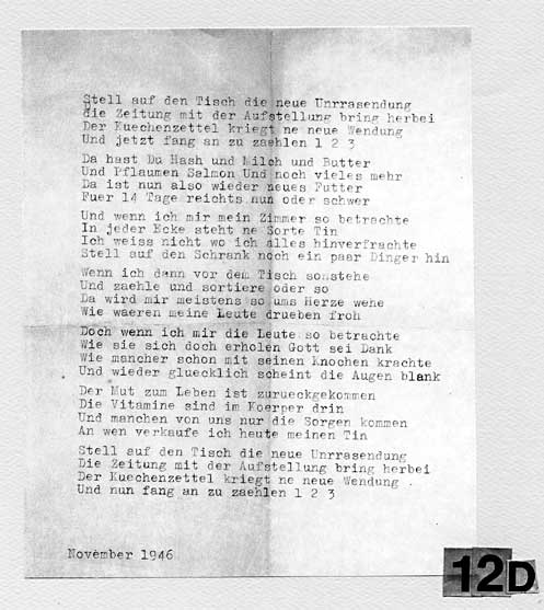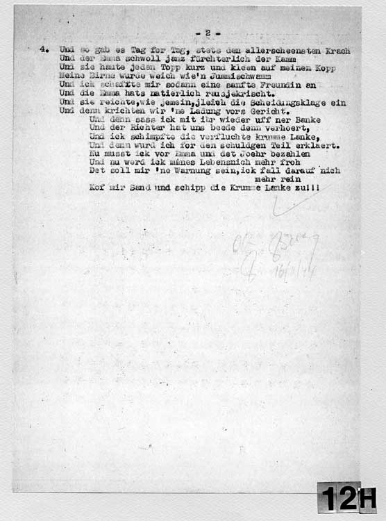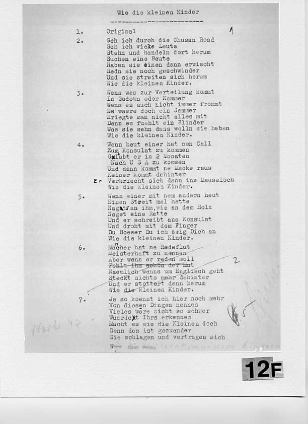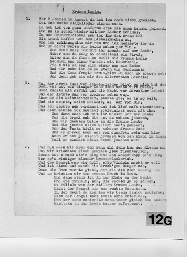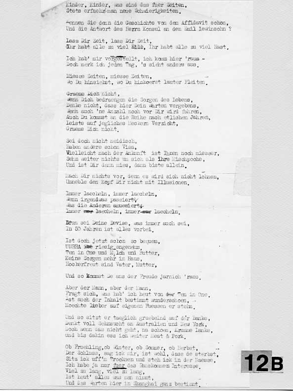 12, 12B, 12C, 12D, 12E, 12 F, 12G and 12H we see a draft of several comical skits he used on different occasions, which depicted the time spent in the ghetto. His trademark was a humorous sketch called "Die Krumme Lanke". It became so popular that the Joint House intertwined it in a farewell letter. The letter is shown in figure 13.