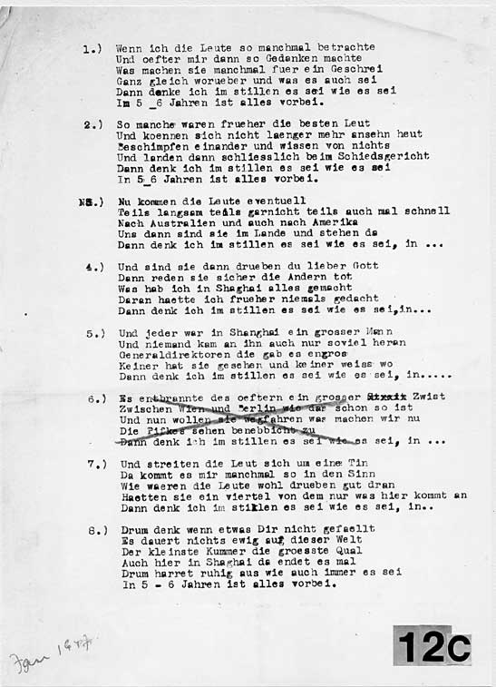 It remains a fact that often funny sketches and jokes originate when a homogeneous group of people are clustered together under primitive and trying circumstances. Gottschalk using his wit and talent, took advantage of which surrounded him in the Hongkew Jewish Ghetto and produced skits that made us laugh and forget our miseries.