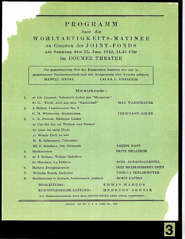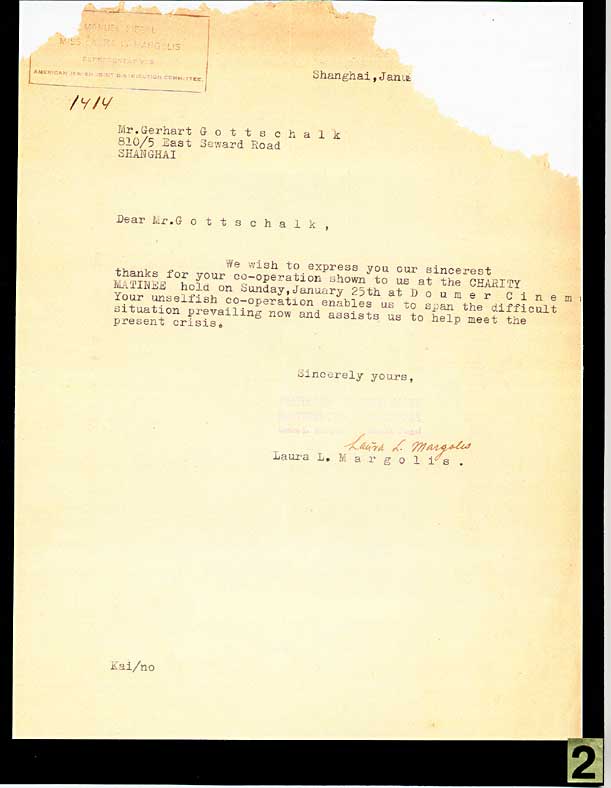 A letter of appreciation to Mr. Gottschalk sent by Laura Margolis for supporting a benefit concert is shown in figure two. The program of the concert held at the Doumer Theater is illustrated in figure three. Margolis, as we may remember, who came from America, saved the lives of some 4000 Jewish refugees at considerable personal risk to herself before she became interned by the Japanese authorities.