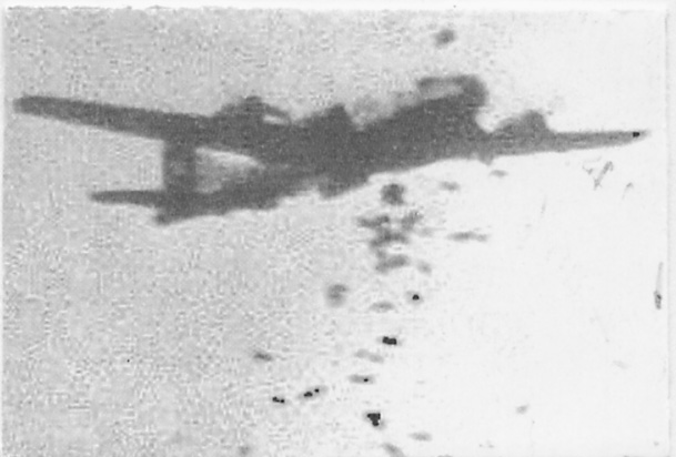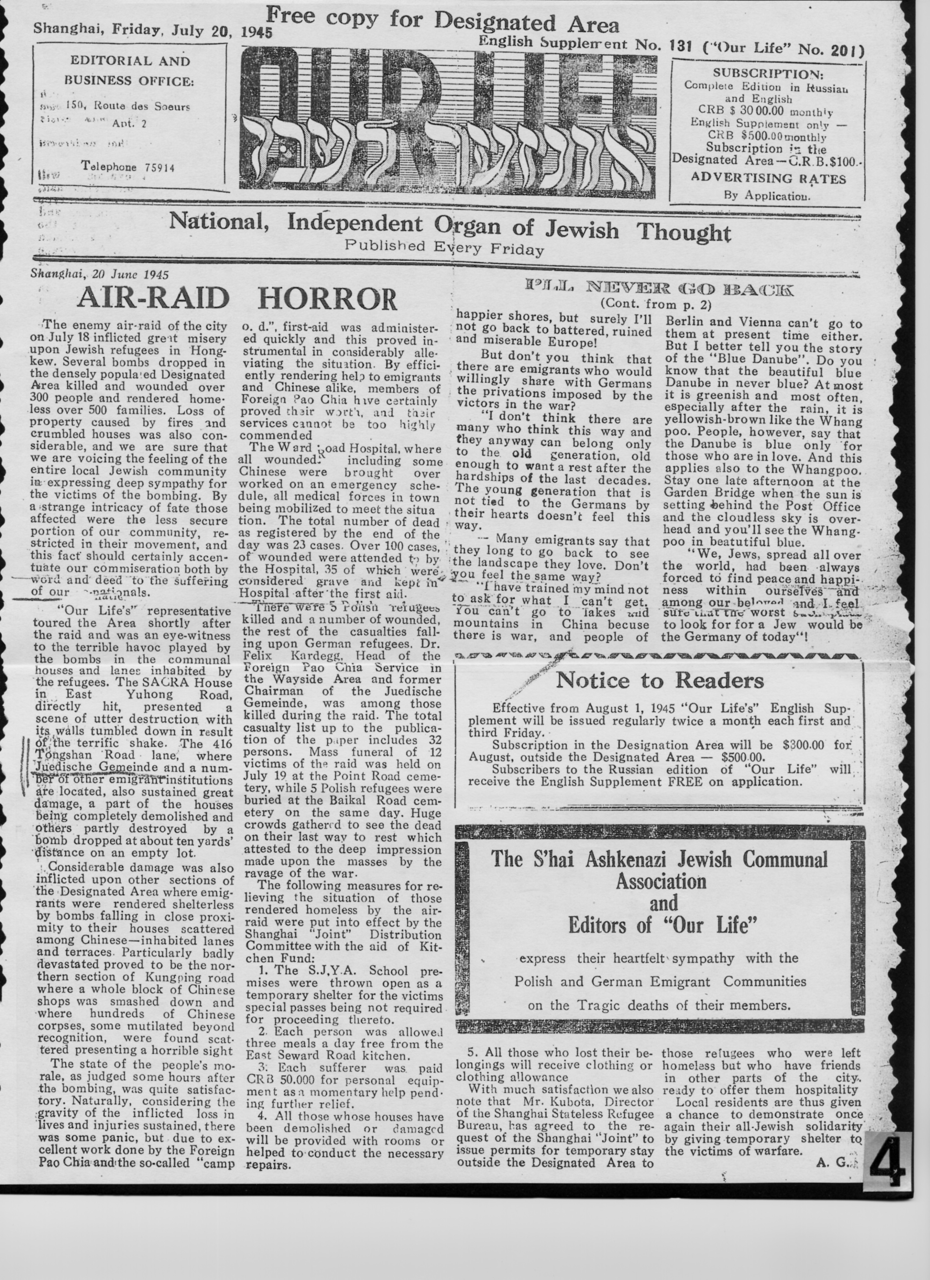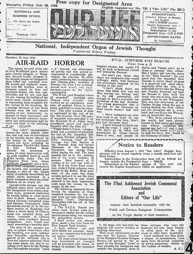 Most of the planes reached Shanghai around noontime, flying above a solid overcast that made visibility of their respective targets impossible. The only lead available to the bombardier was the approximate flying time from Okinawa to Shanghai. As a result, some of the 263 bombs dropped on Shanghai landed inside the populated Hongkew Ghetto. A more detailed account of the devastation caused by the stray bombs was printed in the weekly newspaper, "Our Life," National Independent Organ of Jewish Thought, shown in figure four.