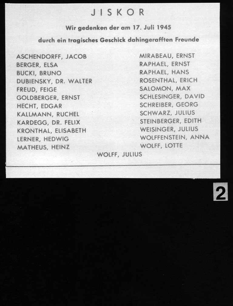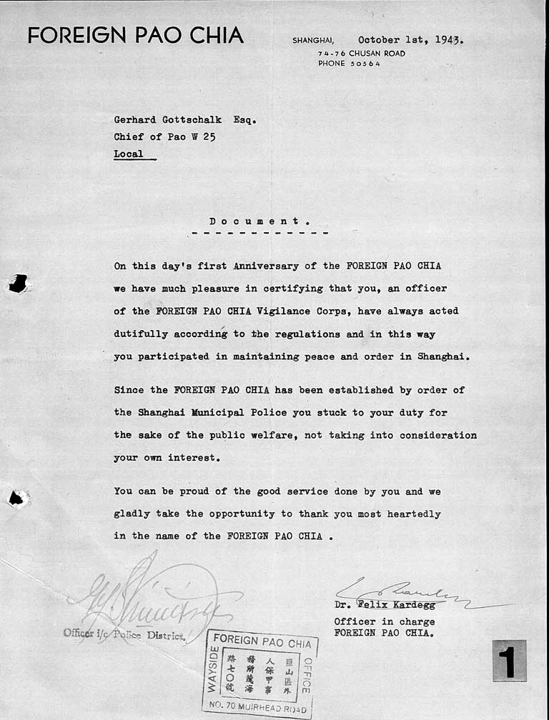 very year in July, Shanghailanders will recall the worst air-raid in the Hongkew Ghetto that occurred close to the end of the war. On that day, July 17, 1945, two-hundred and fifty people lost their lives, and five-hundred were wounded. Among those killed were thirty-one Jewish refugees that included the head of the Jüdische Gemeinde, and organizer of Pao Chia (Refugee Auxiliary Police), Dr. Felix Kadegg. A letter still written and signed by Dr. Kadegg is shown in figure one. Other Jewish refugees that met their fate on that tragic day were remembered on Yizkor, 1983 in the Hongkew Chronicle. The list is shown in figure two.