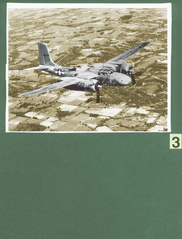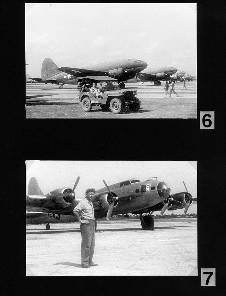 A photo of a row of C-46 air freighters, ready to be overhauled by a crew of refugee mechanics posing in a jeep, is shown in figure six. A photograph of a four-engine US. bomber with my stepfather, Victor Stummer, standing in front of the plane, is shown in figure seven.