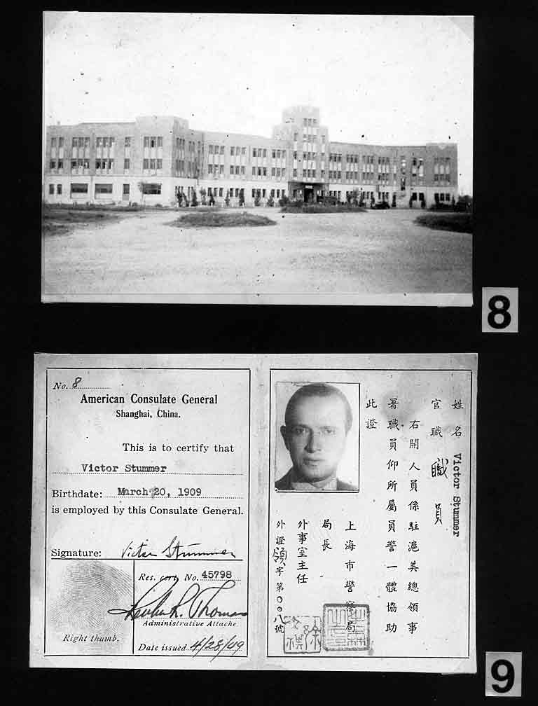 Chiangwan airfield was one of the targets sought by US. Air Force to be bombed on the 17th of July. A large building at the airfield, illustrated in figure eight, became the US. Headquarters after the American Forces arrived in Shanghai. Located in the building was the office of the American Consulate General that employed a number of civilians and Jewish refugees. Figure nine shows an identification card stating that my step-father is employed by the American Consulate General. In figure ten, we see a group of refugee workers, including my stepfather, posing with US. Air Force officers and crew in front of the building.