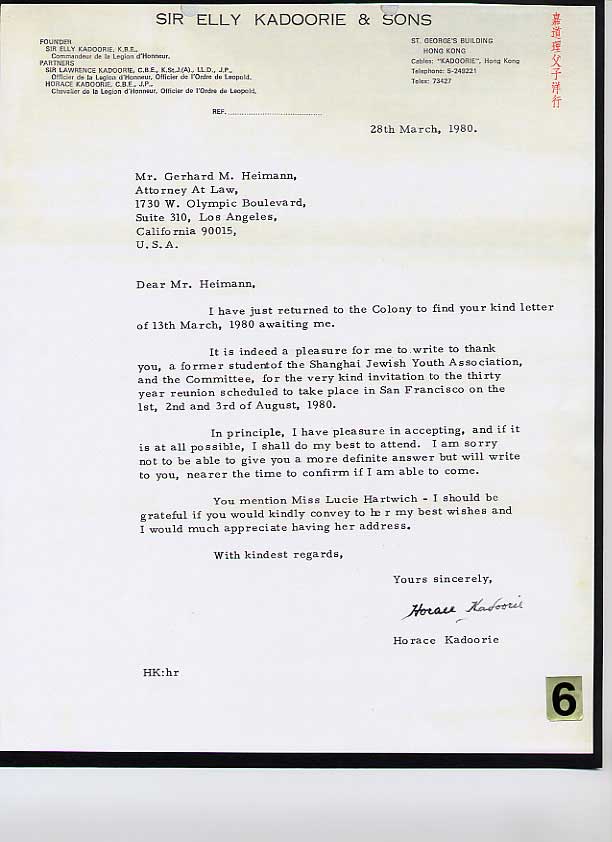 had large business interests in the Far East. In 1941, the school building on Kingchow Road had to be returned to the Chinese, and the school had to find a new facility. Horace Kadoorie came to the rescue again by raising the necessary funds required for a new place to house all the young students. A “U” shaped, one story building with modern facilities was built at 627 East Yuhang Road, conveniently located in the heart of the Jewish ghetto, also called “Designated Area “. The school with a student-body of approximately 600, and 17 teachers under the able direction of Ms. Lucie Hartwich, which included two kindergarten classes, shown in figure two, opened on January 2, 1942. A wide array of the basic subjects, secular in orientation, as for example art and creativity, illustrated in figure three, were offered to the students. Many of the other subjects taught are shown on a report card in figure four. Religious festivals, however, were also observed, as for example Purim, shown in figure five, when students dressed in costumes portraying biblical characters in the school auditorium. There were also Friday evening Shabbat services at the school, with students doing the early part followed by a regular adult service. Another popular and highly respected member of the community and of the Kadoorie School faculty was Leo Meyer, a well- known soccer player and teacher who encouraged sports activities among the young, and much needed moral guidance to children who were in need of it. In 1980, a former student of Kadoorie School sent a letter to Horace Kadoorie, inviting him to address the Shanghailanders at their first major reunion in Oakland, California. Kadoorie‘s response is shown in figure six. It was there, at the reunion, where Sir Horace Kadoorie met Ms. Lucie Hartwich again, shown in figure seven, and many of her students. Yours truly was lucky to meet after so many years his teachers and mentors, Lucie Hartwich in 1964 at Lake Tahoe, and Leo Meyer in the mid-70‘s in Los Angeles, shown in figure eight and nine respectively. In the meantime, Sir Horace Kadoorie, leaving behind a great legacy passed away in Hong Kong in 1995. Ms. Lucie Hariwich, a true legend, who today after fifty plus years is still often remembered by her former students, passed away in August of 1984 in San Francisco. References: |