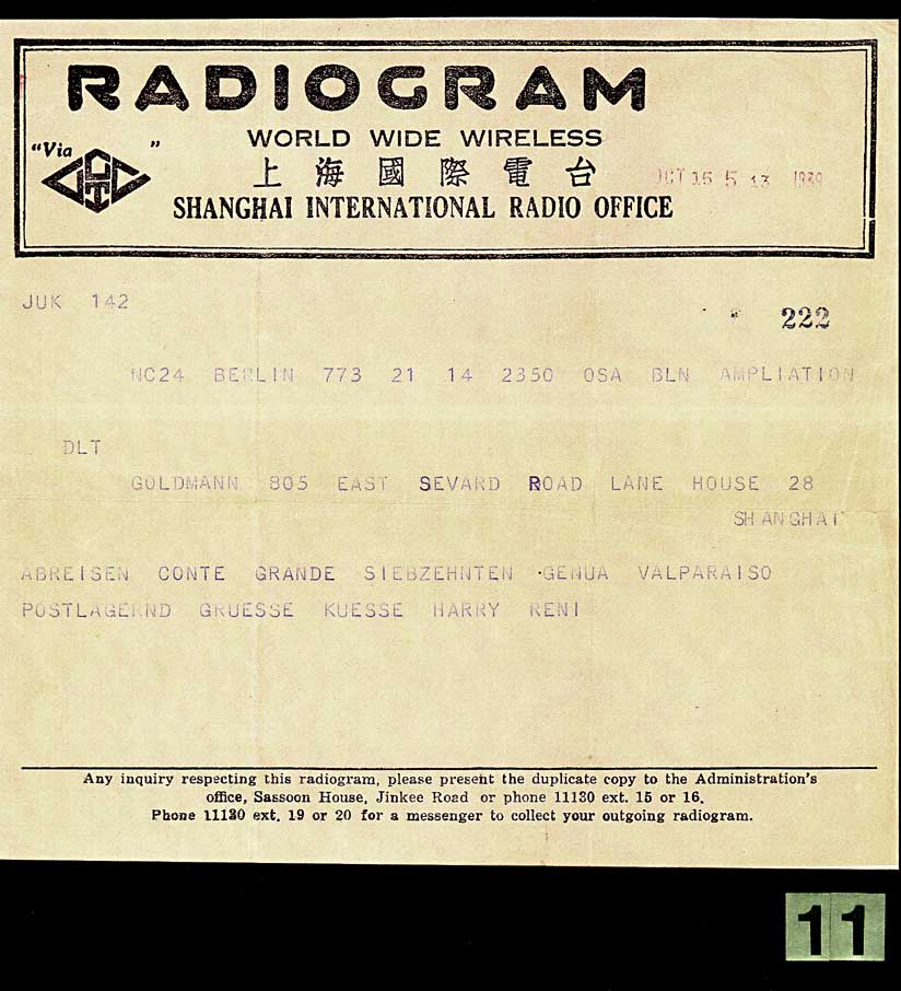 Figure 11 shows a message on a radiogram from relatives in Europe to the family Goldmann that had already previously arrived in Shanghai. The message conveyed their departure date from Genoa on the Conte Grande.