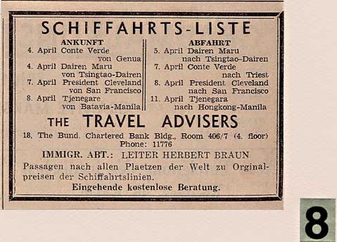 Figure eight shows a list of ships, including the Conte Verde, arriving and departing from Shanghai.