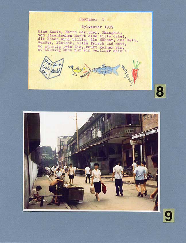 A fun postcard dedicated to my father at a 1939 New Years party, shown in figure eight, tells how he enjoyed shopping for food at the Hongkew Market, referred to at the time by the Jewish refugees as “Der Japanisher Markt”